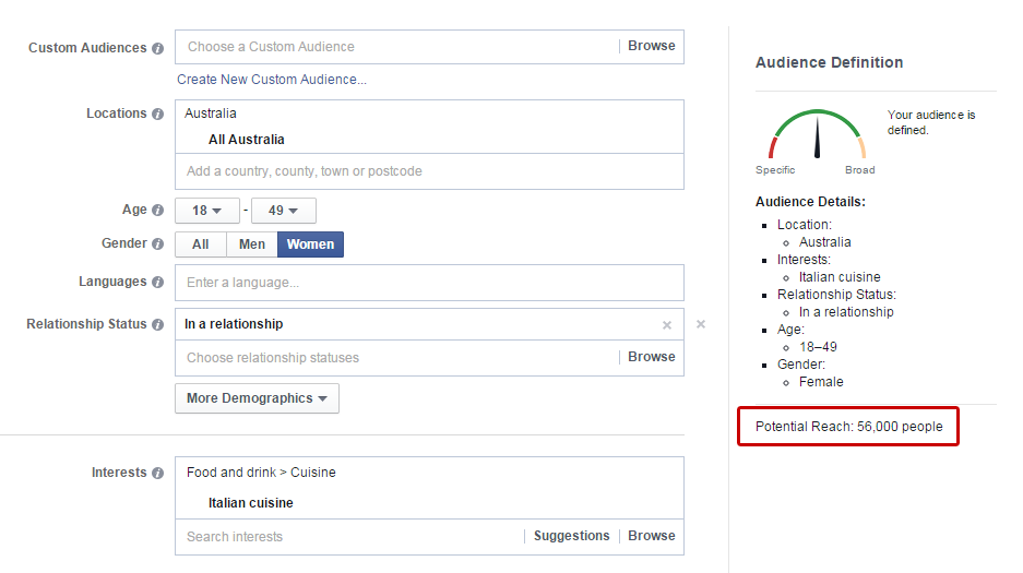 You may be thinking to yourself, “But I can already reach a large amount of people if I target by demographic and interest”. While it’s true that you can reach 56,000 Australians who are aged between 18-49, female, in a relationship and like Italian cuisine; you will likely find these audiences to be broad and may subsequently struggle to be relevant to them with your posts. Because of this, you will expect to see a higher CPE on this broad targeting when boosting posts.