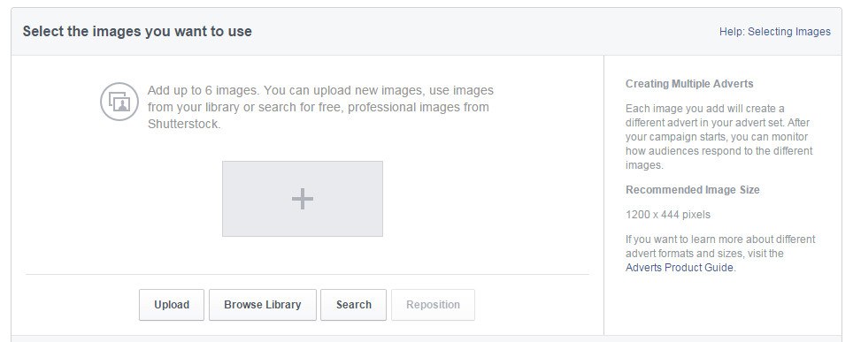 Upload or choose up to 6x images in a landscape aspect ratio (1200px x 444px if possible) that visually bring to life your brand. Facebook will automatically run all ad variations to your chosen audience and serve more of the most successful variation: