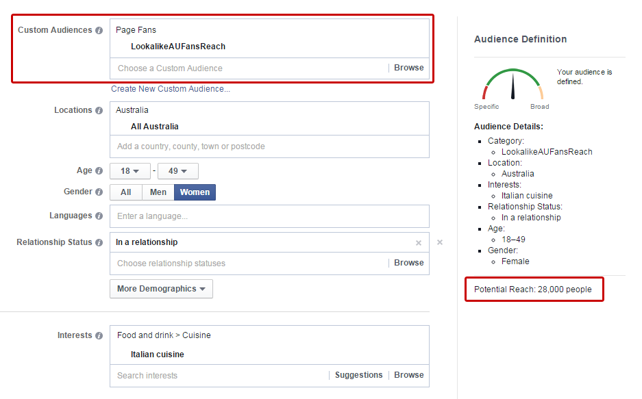 You may be thinking to yourself, “But I can already reach a large amount of people if I target by demographic and interest”. While it’s true that you can reach 56,000 Australians who are aged between 18-49, female, in a relationship and like Italian cuisine; you will likely find these audiences to be broad and may subsequently struggle to be relevant to them with your posts. Because of this, you will expect to see a higher CPE on this broad targeting when boosting posts.